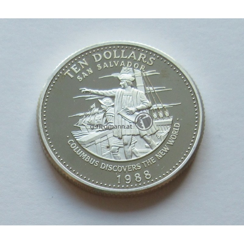 Bahamas, Silber 10 Dollar P.97 "Kolumbus, Anblick der neuen Welt", Erhaltung: PP